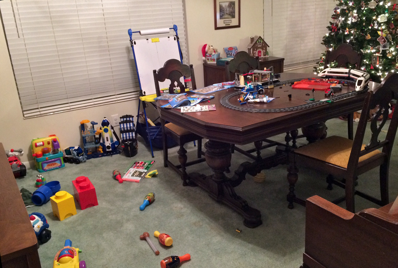 A few hours later, both kids spread out paper and markers on the floor and started making Christmas books. (Said Christmas books had pictures of Christmas trees, rattlesnakes, and worms – hey, they’re boys.) I was touched, not just because I’m a writer, but because they worked so well together, and they were totally into their project. And they wanted me to help, too. Again, I had any number of other things that I could have done, but these books, while not Caldecott candidates, are very important to them. So I let them trace my hand, and I added a choo-choo train to the snake-and-worm collage.